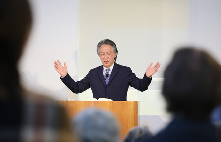 〔写真説明〕礼拝を執り行う元主任牧師の佐藤彰さん=2月15日、福島県いわき市の福島第1聖書バプテスト教会