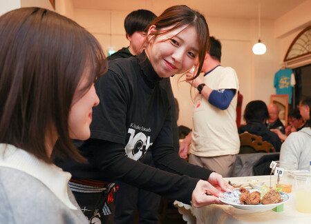 〔写真説明〕岩手県の郷土料理を紹介する、きっかけ食堂ボランティアの栗原花音さん(中央)ら=2月14日、東京都渋谷区