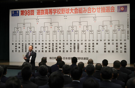 第98回選抜高校野球大会(19日開幕、甲子園球場)の組み合わせ抽選会は6日、大阪市の毎日新聞大阪本社オーバルホールで行われ、連覇が懸かる横浜(神奈川)は、神村学園(鹿児島)と第2日第2試合での対戦が決まった。