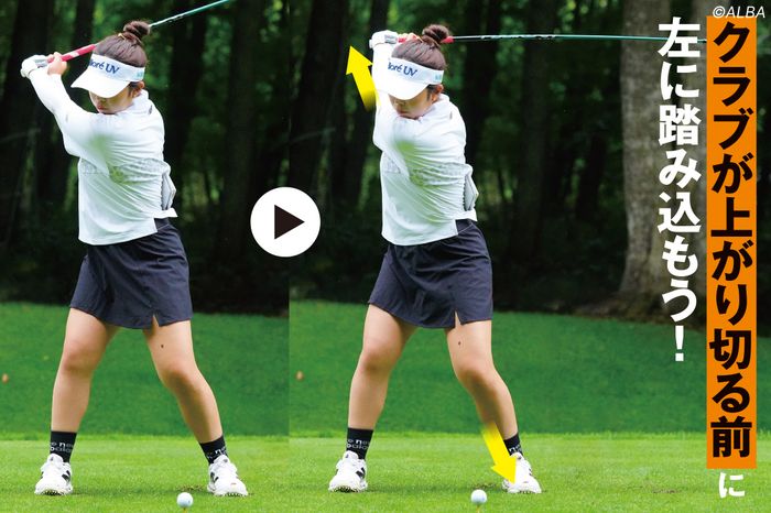 【安岡】 バックスイングからトップでは右足に、ダウンスイングからインパクトでは左足に体重移動すると思っている人は多いです。でも実は、トップで左足に乗っていないと地面を強く踏めません。山下美夢有さんのトップを見てみると、クラブが上がる方向と拮抗させるように左足を踏んでいる。