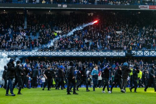 我慢の限界を迎えたレンジャーズサポーターがピッチに乱入し、セルティックのスタッフが襲撃を受けたほか、『BBC』は別のレンジャーズファンがセルティックに所属するメキシコ代表DFジュリアン・アラウージョに襲いかかったことも伝えており、お互いに発煙筒や照明弾などを投げ合っている様子も見られるなど、大荒れな展開となった。