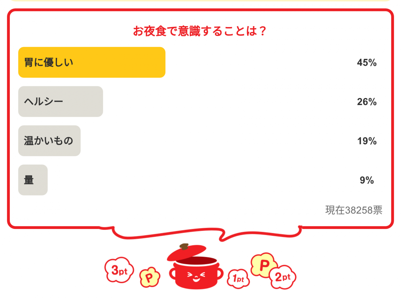 約半数の方が「胃に優しい」を選びました。夜に食べるものだからこそ、負担の少ないものを選びたいですね。
