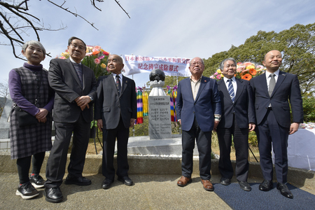 〔写真説明〕石碑の前に立つ被爆者団体の代表ら=8日、長崎市