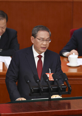 〔写真説明〕5日、北京で開かれた全国人民代表大会で政府活動報告を行う中国の李強首相(AFP時事)