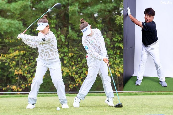 ●山下のスイングを詳細分析! 関連記事『山下美夢有はトップで左足体重!? クラブが上がり切る前に左に踏み込むと飛ぶ!』を詳しく読めば、その秘密が分かります。