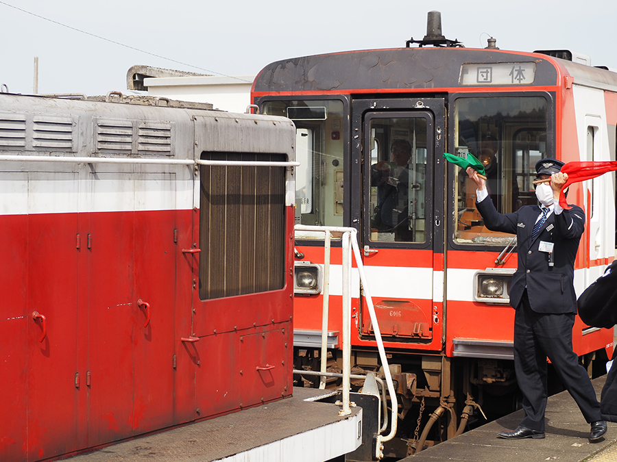 集合場所の鹿島臨海鉄道大洗鹿島線の大洗駅(大洗町)では、1979年製と同社の現役車両で最古参のDL「KRD5号機」が先頭につき、ともに日本車両製造が1990年に製造したディーゼル車両6000形2両と連結して80人の参加者を迎えました。この変わった編成で、通常は旅客列車が走らない区間にも乗り入れるなど「異色ずくめ」の行程が幕を開けました。
