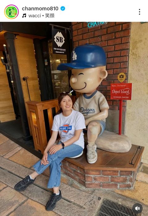 公開した3枚の写真はアメリカンビレッジで撮影したもの。最初は「日本一長い」が名物のソフトクリーム店にある5段重ねソフトの看板の横に立ち、大きな口を開けて今にもかぶりついてしまいそうな写真。そしてロサンゼルス・ドジャースの帽子とTシャツ姿の大きな少年の模型と一緒に撮れる人気フォトスポットでの写真だった。