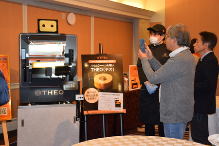 急激に進化する人工知能(AI)と人間の役割を考えるセミナーが京都市南区で開かれた。会場ではAIにバウムクーヘンの焼き加減などを学習させた菓子メーカー・ユーハイム(神戸市)の自動焼き上げ機「THEO」(テオ)の実演が行われ、参加者は熱心に見入っていた。