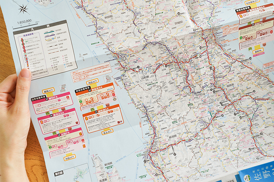ハイウェイウォーカーは有名人を表紙にした情報誌と管内のガイドマップを収録した冊子でしたが、ハイウェイまっぷる SA・PAガイドマップは折図の大きな地図になっています。「紙を広げれば地図とSA・PAの施設情報を同時に見ることができ、情報量が充実しつつも視認性の高いレイアウトとしています」とのこと。