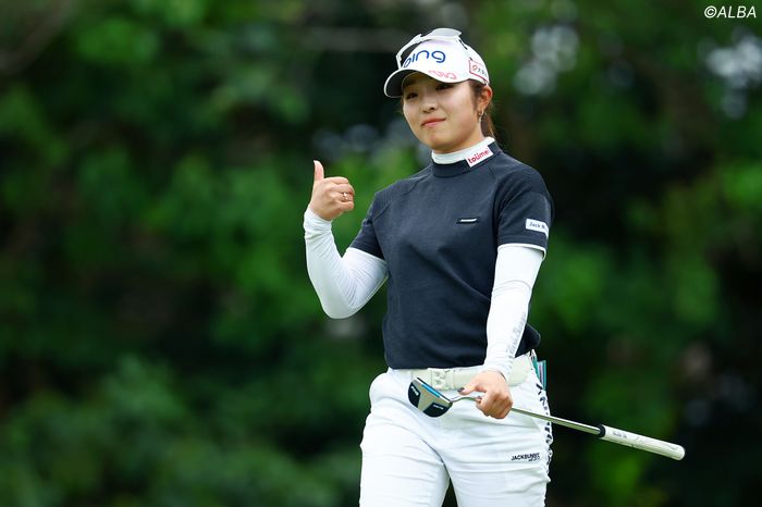 笑顔で親指を立てた。8番パー3。グリーン左手前のバンカーから2打目をピン横1.5メートルに寄せて、カップの真ん中から沈めた。初日からのスコアはバーディとパーだけ。開幕からの連続ボギーなしを44ホールに伸ばし、ツアー記録を更新した佐久間朱莉が“いいね!”のサムアップだ。