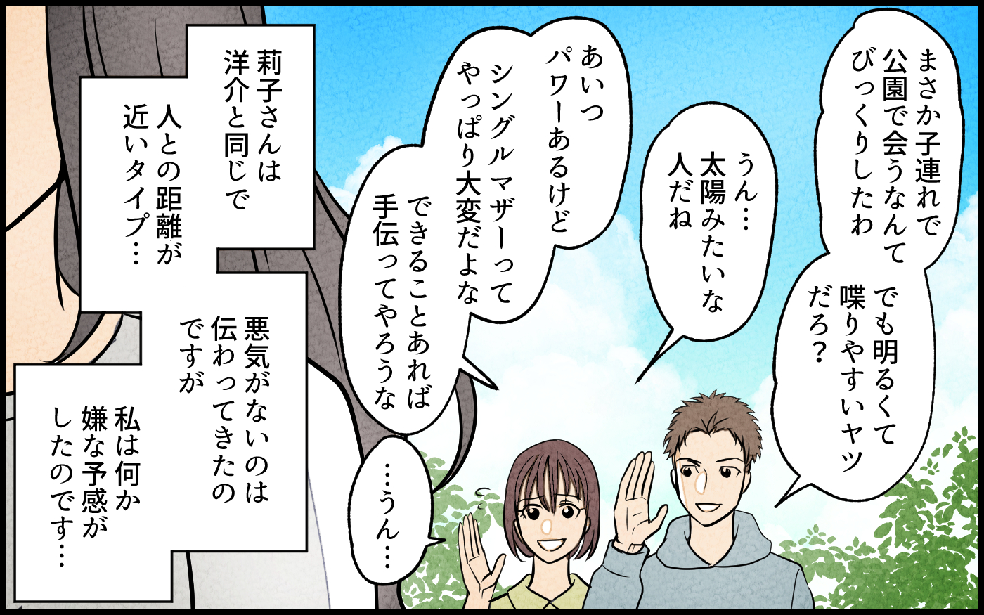 「だから近いってばぁ!」ふだんから女友だちと距離感がおかしい夫…ついに見過ごせない女が現れた!? 2026年3月22日 22:05 ウーマンエキサイト 中 大 「防衛装備移転三原則」とは? こういう嫌な予感って当たるんですよね…。 旦那さんは人付き合いが得意なタイプみたいですが、肝心な奥さんの気持ちはわかっていないみたいです。 「シンママって大変だよな!手伝ってやろうな!」ってことで、一緒に行動することがどんどん増えていき…!? 【まんが】夫の親友は女性でした 関連記事【まんが】夫の親友は女性でした突撃訪問の翌日 態度が一変?戸惑うシンママが下した最後の決断【開示請求待ったなし Vol.33】PTAを理由に教室へ出入りする保護者…担任が突きつけた一言とは?【私はモンペじゃありません Vol.33】「なんだ、動けてるじゃん?」帰宅するなり夫に言われモヤモヤ…そんなこと言う人だったの!?長文メッセージを読み進める妻、予想外の展開に震えが…【夫にもう1つの家庭が? Vol.36】