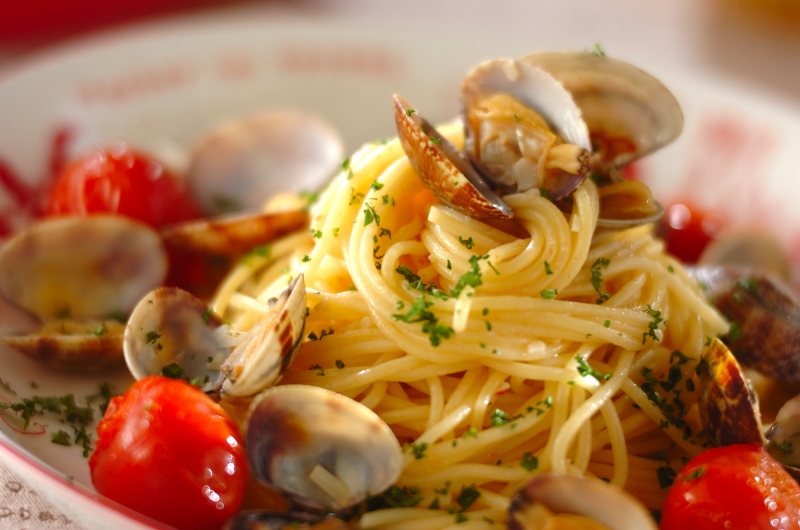 3. フライパンにスパゲティーとプチトマトを加え、煮汁とからませながら水分がなくなるまで強火で加熱する。器に盛り、アサリをのせてパセリを散らす。