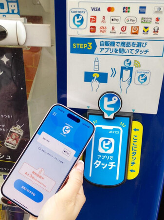サントリー食品インターナショナルは独自の決済アプリ「ジハンピ」を昨年から全国展開している。購入時の面倒な自販機操作が不要で、アプリを立ち上げてかざすだけで決済できる利便性を売りに対応機の平均売上額を伸ばすことに成功した。