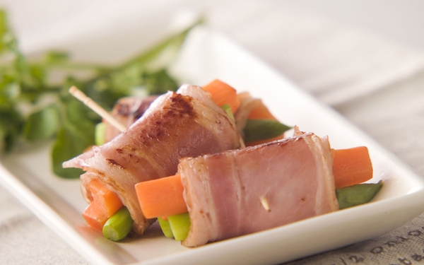 ニンジンとアスパラガスを一緒に巻けば、お弁当がパッと華やかになります。野菜を前日に茹でておけば、朝はベーコンで巻いて焼くだけ。ベーコンのほど良い塩気と旨みのおかげで、野菜が苦手な子どももパクパク食べてくれるお助けメニューです。