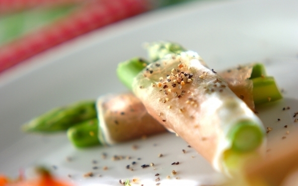 茹でたアスパラガスを生ハムでくるりと巻くだけの超特急レシピ! 生ハムの塩気がアスパラガスの甘みを引き立てて、ついついお箸が伸びてしまいますよ。見た目もおしゃれなので、ワインを楽しむ夜のサイドメニューや、おもてなしの最初の一皿にもぴったりです。
