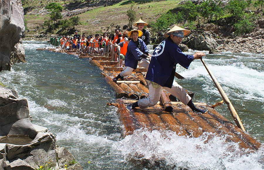 また、その魅力については「この筏下りの魅力は、激流を下るスリルと筏ならではの安定感にあります。船底が平らな構造だからこそ、激しい流れの中でも安定した乗り心地が実現されています。さらに、深い淵では筏師が櫂を操り、ときにはロープを引きながら進む場面もあり、その熟練の技を間近で体感できます」と解説しています。