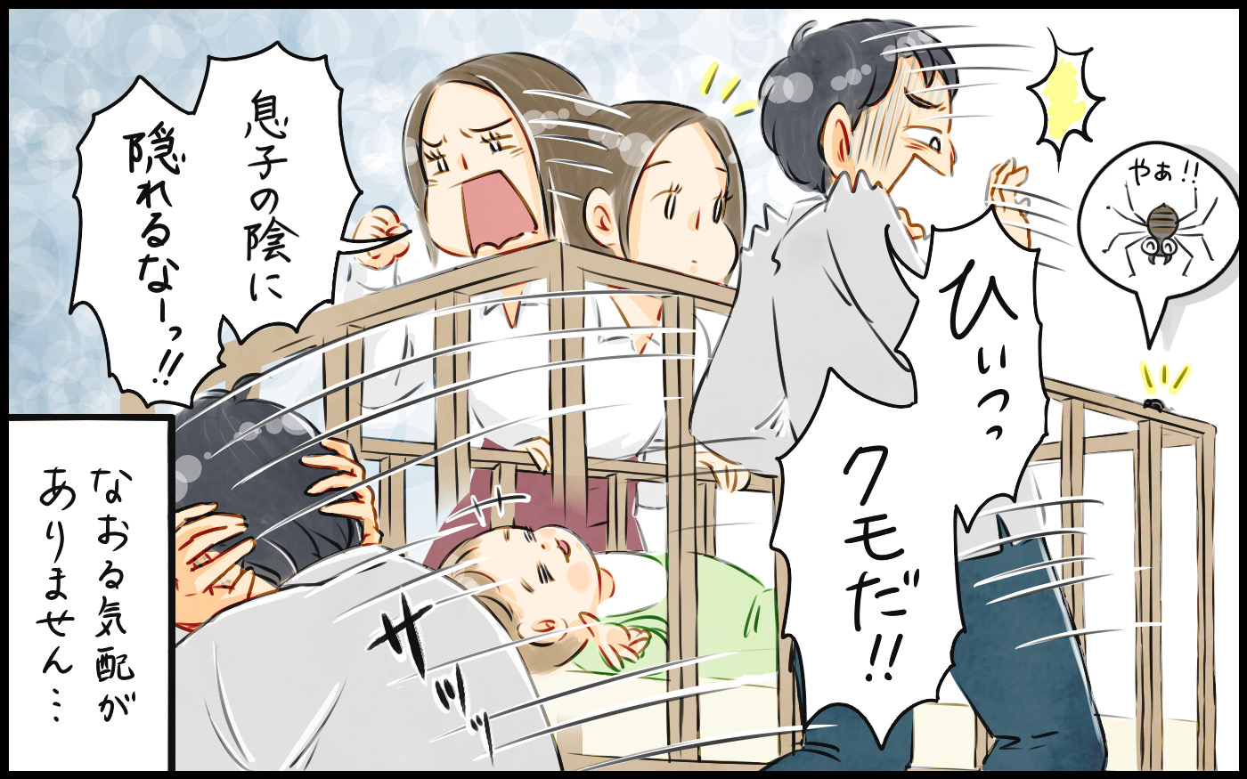 小さな虫一匹で大騒ぎし、幼い息子を守るどころか妻を盾にして逃げ回る情けない振る舞い。