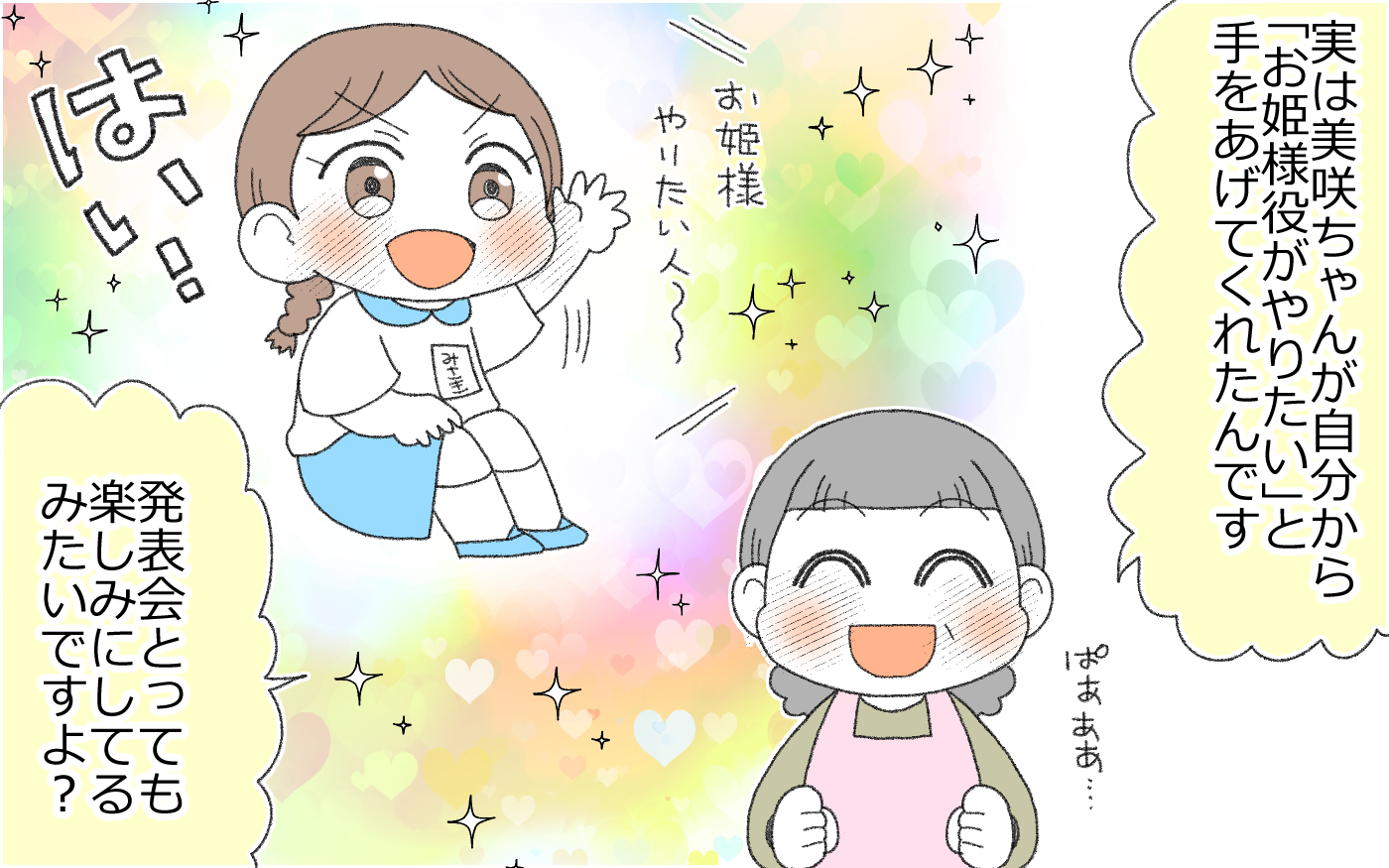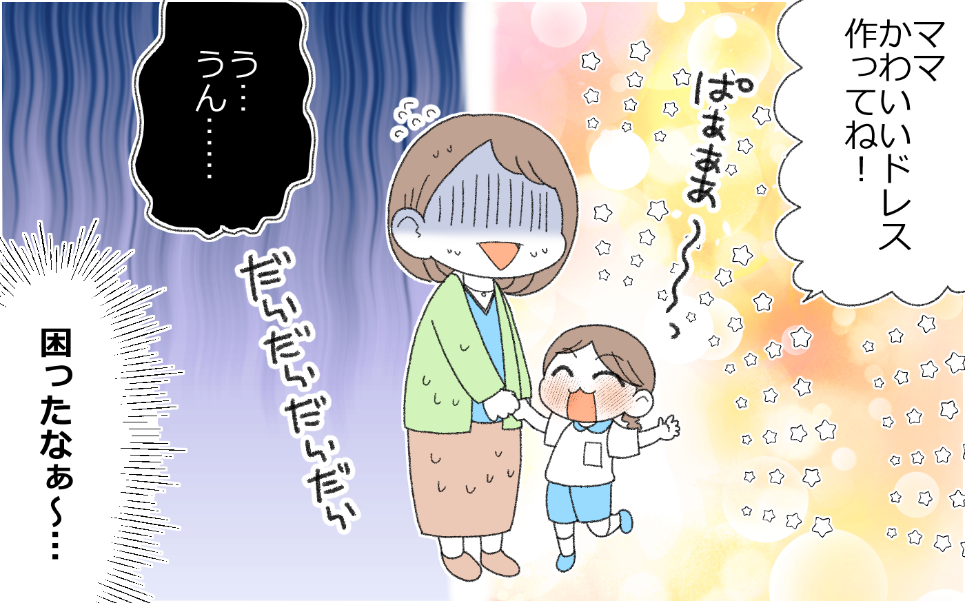 自分が作った残念な衣装のせいで、晴れ舞台で子どもが恥ずかしい思いをするんじゃないかと、焦りと不安が入り混じり…。