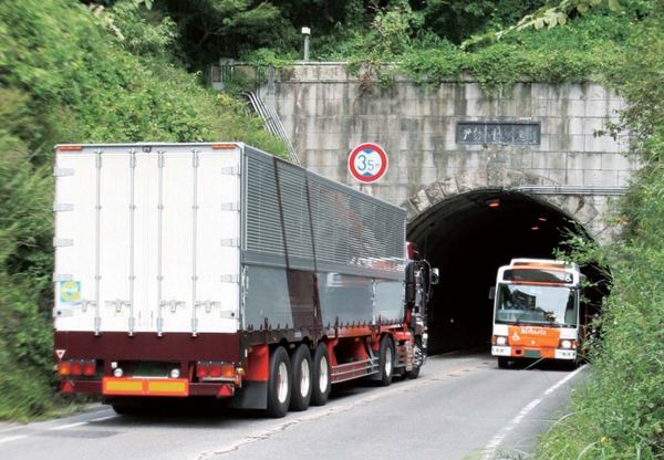 トンネルが通る伊勢神峠(標高780m)は古来からの“難所”で、周辺には明治時代の旧道トンネルも残ります。現在の伊勢神トンネルは1960(昭和35)年に完成したものの、古い設計のため断面が狭く、トラックの離合が困難です。