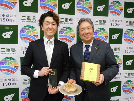〔写真説明〕記念撮影に応じる津市の洋菓子店「トキノワ」の箕田代表(左)と三重県の野呂副知事=19日、三重県庁