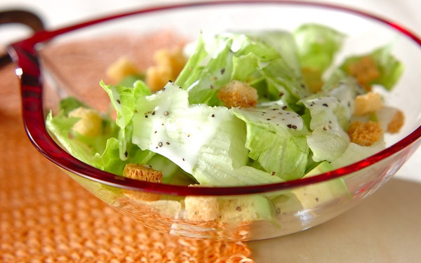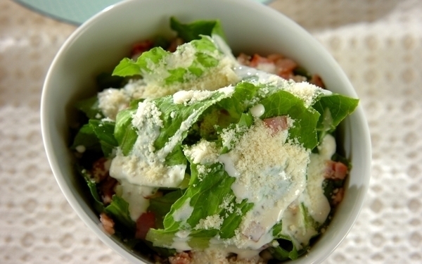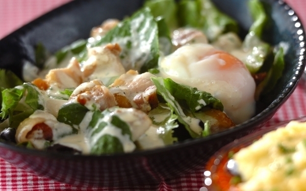 普通のレタスより葉に厚みがあるロメインレタスを使えば、お店のようなシャキシャキ食感に。ほのかな苦みがクリーミーなドレッシングと相性抜群。あえてニンニクを使わず仕上げるので、朝食にも気兼ねなく取り入れられるのがうれしいですね。