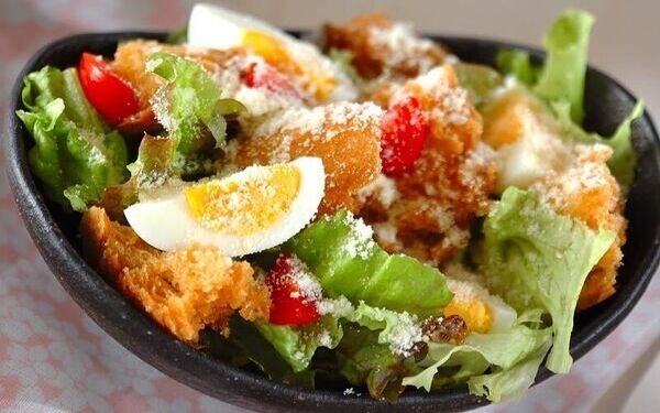 クルトンの代わりに、フランスパンを大きめにカットしてダイナミックに。ゆで卵やプチトマトも添えれば、これ一品で大満足のボリュームになります。アンチョビの塩気が絶妙なアクセントになって、噛むほどにコクが広がるごちそうサラダに仕上がりますよ。