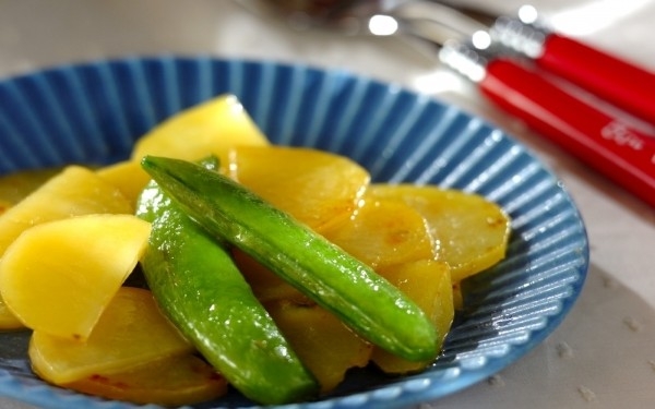 スナップエンドウとジャガイモのハチミツバター炒め