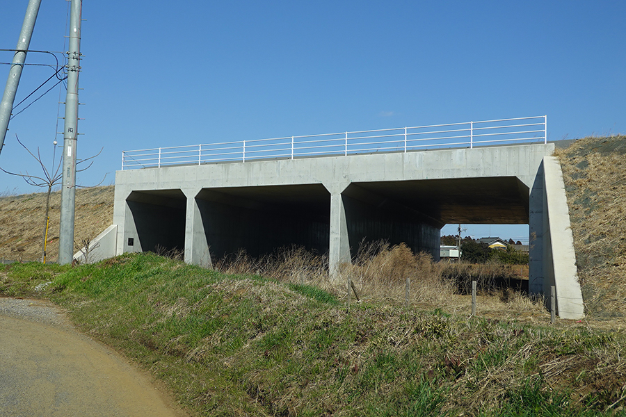 途中にできる「圏央成田IC」の前後は盛土構造です。このため、交差する既存道路とはトンネル(ボックスカルバート)で立体交差していますが、“道路がない場所”にトンネルが口を開けている箇所もあります。