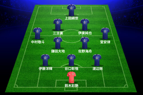 ゴールマウスを託されるのは、スコットランド代表戦で複数回にわたるビッグセーブを見せた鈴木彩艶。最終ラインは右から渡辺剛、谷口彰悟、伊藤洋輝が並び、中盤のダブルボランチは鎌田大地と佐野海舟が形成する。ウイングバックは右に堂安律、左に中村敬斗が入り、2シャドーは三笘薫と伊東純也の組み合わせ。最前線には上田綺世が入ると予想される。