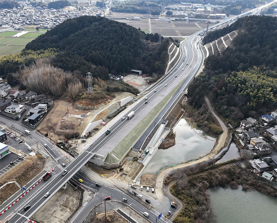 新規区間の開通後も栗東水口道路では側道の工事が進められ、今回、金勝川沿いの県道川辺美園線から、以前の終点だった県道上砥山上鉤線と接続する「小野ランプ」まで、盛土の両側を活用した側道が開通。小高い丘陵で隔てられていた地域から、小野ランプを通じて湖南方面の本線へアクセスしやすくなります。