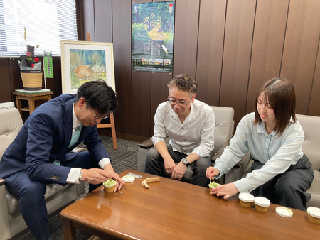 〔写真説明〕玉露ジェラートを試食する京都府宇治田原町の勝谷聡一町長(左)=3月30日、同役場