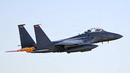 〔写真説明〕対イラン軍事作戦「壮絶な怒り」で出撃する米空軍のF15戦闘機=3月16日、撮影場所非公開(同軍提供)(AFP時事)