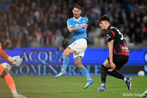 それでも79分、ついにナポリがゴールをこじ開ける。アリソン・サントスが敵陣左サイドの深い位置で起点を作り、内側を駆け上がってきたマティアス・オリベラが柔らかいクロスを供給。一度はコニ・デ・ヴィンターに弾かれるも、ファーサイドに流れたボールをマッテオ・ポリターノが左足のダイレクトボレーで蹴り込みネットを揺らした。