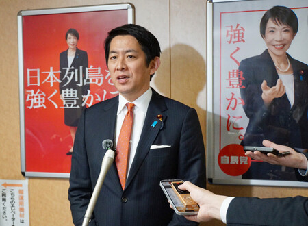 〔写真説明〕記者団の取材に応じる自民党の小林鷹之政調会長=8日午後、東京・永田町の同党本部