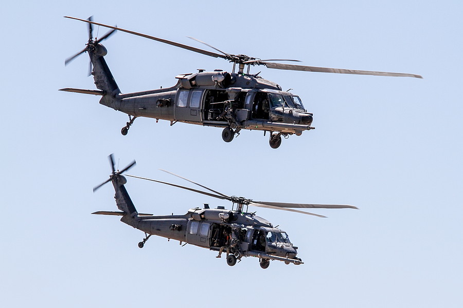 現在の米空軍CSARでは、主に3種類の航空機が中核を担います。まず、実際に搭乗員を回収する救難ヘリがHH-60W「ジョリーグリーンII」です。機体側面には重機関銃や7.62mmミニガン(ガトリングガン)を装備可能で、空対空ミサイルをかく乱するチャフ・フレアや各種警報装置を備えた、まさに“戦場仕様”の救難ヘリです。