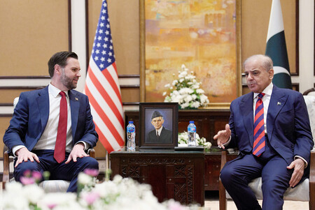 〔写真説明〕11日、イスラマバードで会談するバンス米副大統領(左)とパキスタンのシャリフ首相(AFP時事)