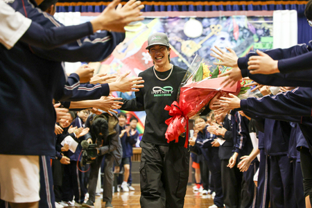 二階堂選手は、所属先の日本ビールとともにステージ用の幕を学校に贈呈。後輩から花束を受け取り、笑顔を見せた。【もぎたて便】