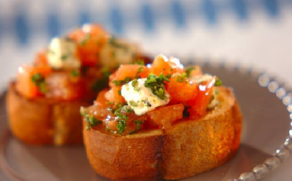 カリッと香ばしく焼いたバゲットに、トマトとクリームチーズをのせたオシャレなカナッペです。一口頬張ると、オリーブオイルとニンニクの香りが鼻から抜け、奥行きのある味わいを堪能できます。お好みでバゲットの厚みを変えるのもアリです。