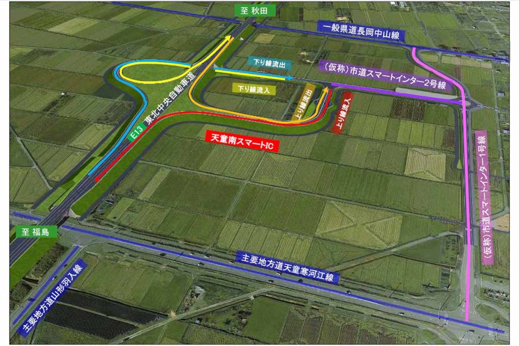 天童市(山形県)とNEXCO東日本東北支社は2026年4月17日、東北中央道に接続するスマートICの名称が、「天童南(てんどうみなみ)スマートIC」に決定したと発表しました。