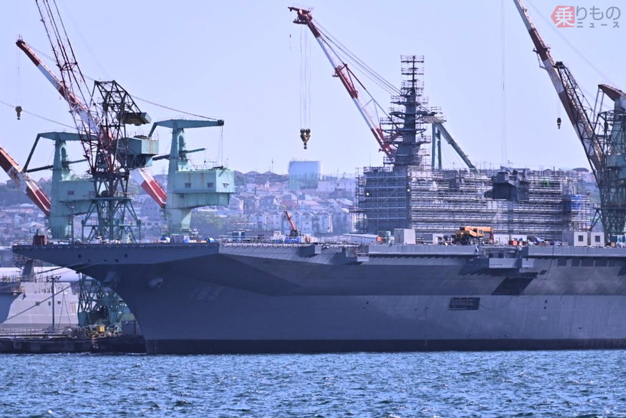 2026年4月現在、ステルス戦闘機F-35B「ライトニングII」の搭載に向け、JMU(ジャパンマリンユナイテッド)横浜事業所磯子工場で改修中の護衛艦「いずも」が、その形状を大きく変え、同工場の岸壁に姿を見せました。