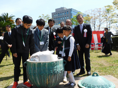 〔写真説明〕50年前の1976年に埋設されたタイムカプセルを掘り起こし、中身を見る子どもたち=18日、県庁