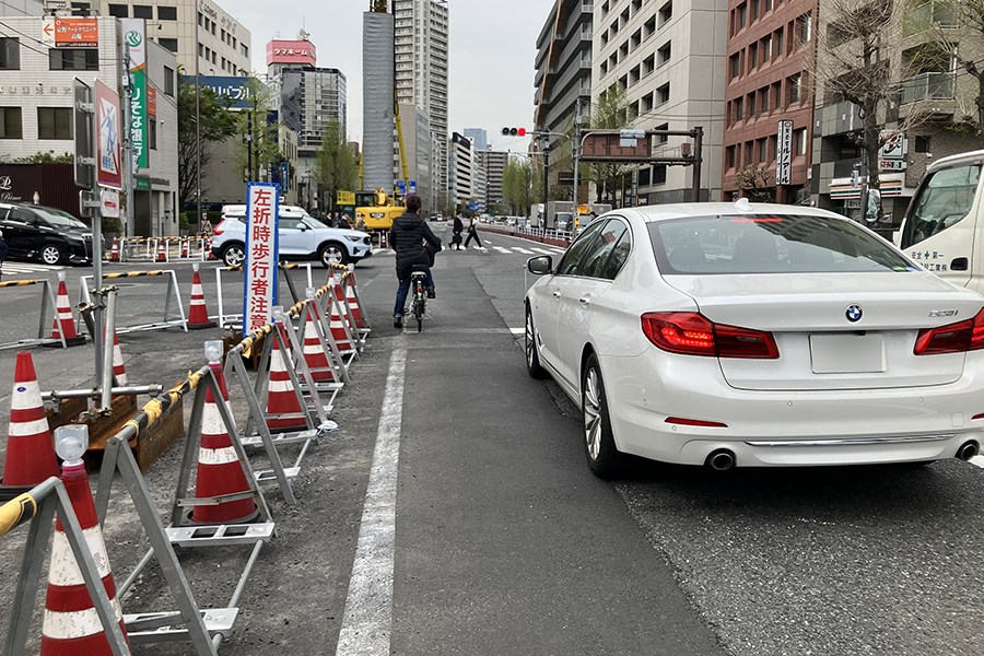 再開発工事が道路を占有し、車線が従来の半分程度に狭められている区間もあります。工事で車線が2車線しかない区間も、一部は自転車が通行できる充分な空間がありません。引き直された車道外側線の左側(歩道側)ぎりぎりまで工事現場を主張するバリケードが立てられているため、自転車は制限時速60km/hに指定された2車線しかない車道を通行しなければならないのです。