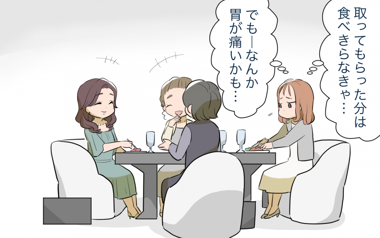 笑顔でランチを楽しむふりをしながら、心の中では必死に計算している…。