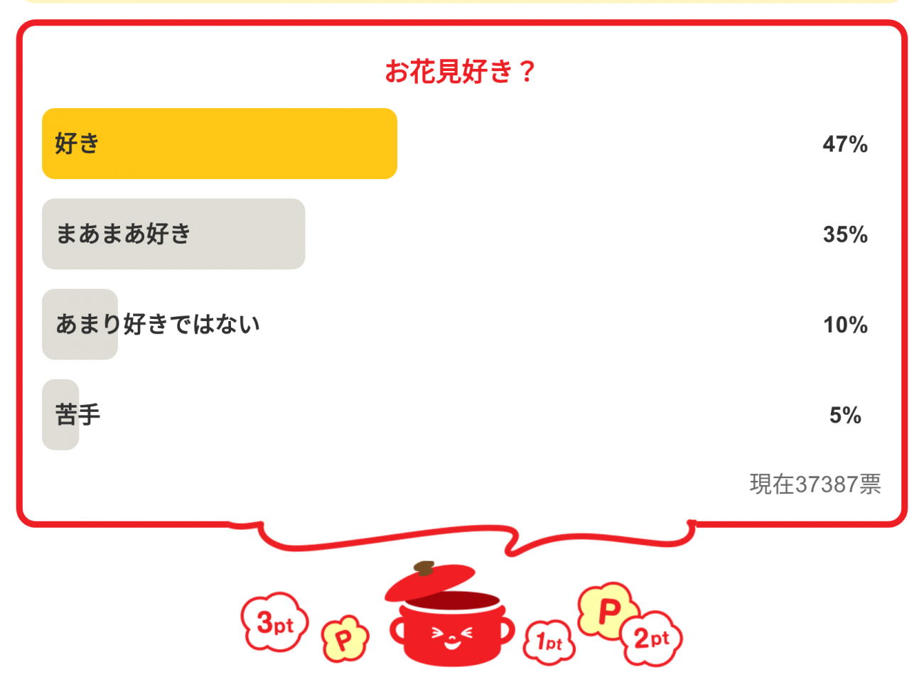 今年のお花見は、どんなスタイルで楽しみましたか?定番の手作り弁当から手軽なグルメまで、自分らしい楽しみ方で春を満喫したいですね。それでは、次回のアンケートもどうぞお楽しみに!