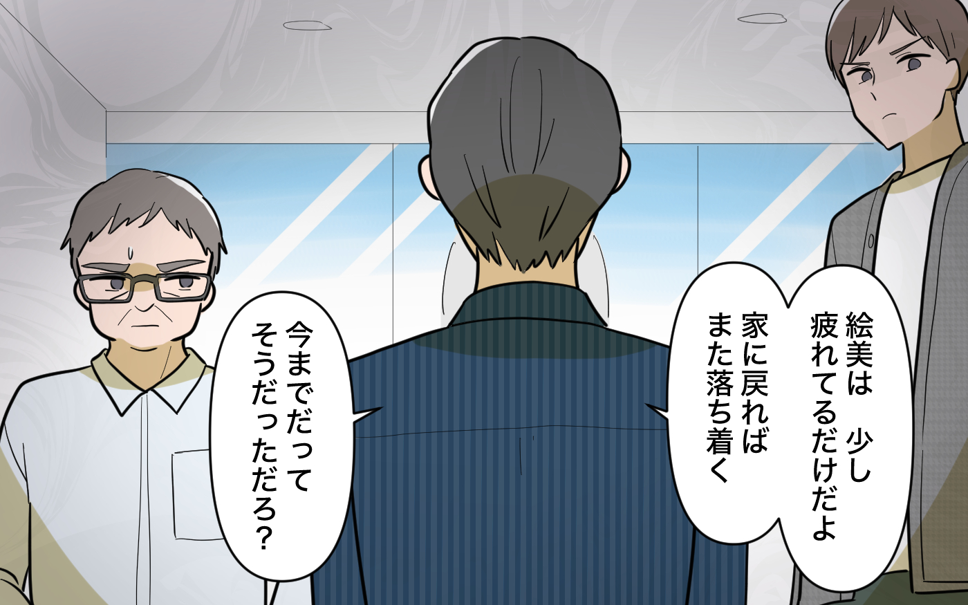鋭斗から逃げた絵美を説得するように言われた父。定年後の生活に揺さぶりをかけるようなことを言われるが、絵美の変化に気づいていた母は「もう終わりにしましょう」と夫を諭す。そしてふたりは絵美のもとへ…。