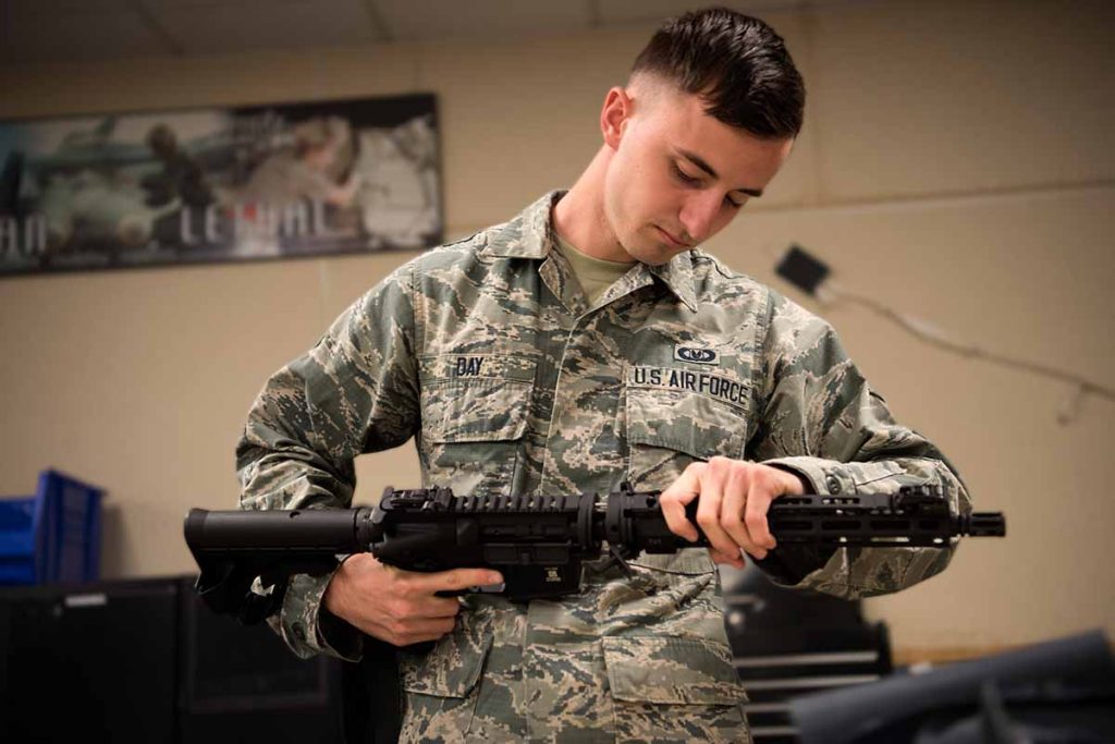 正式名称はGAU-5/A、アメリカ軍で広く使われているM4カービン銃の派生型です。コンパクトにするため2分割でき、30秒以内に結合と分解が可能です。30発入り弾倉4個が付いています。