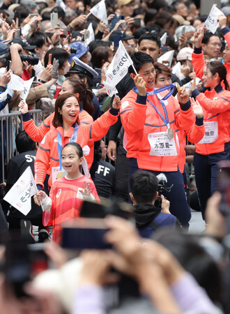 ミラノ・コルティナ冬季五輪・パラリンピックの日本選手団による応援感謝パレードが25日午前、東京・日本橋で行われた。五輪フィギュアスケートのペアで金メダルに輝き、最近引退を発表した「りくりゅう」こと三浦璃来さん、木原龍一さんをはじめ、選手や関係者約120人が笑顔で参加。集まった観衆から温かい拍手と歓声が送られた。