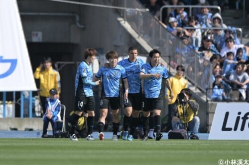 試合は開始すぐの6分にスコアが動く。川崎Fが左サイドでボールを奪い返すと、その流れから脇坂泰斗が右サイドの伊藤達也までボールを展開。最後は脇坂からのパスを受けた山本悠樹が右足でゴール右にシュートを突き刺し、川崎Fが先制した。