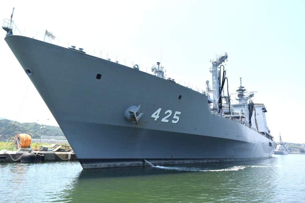 ましゅう型補給艦は全長221m、全幅27m、基準排水量は1万3500トンで、海上自衛隊ではいずも型護衛艦に次ぐ大きさの艦艇です。行動中の護衛艦に燃料や物資を補給する、縁の下の力持ちといえる存在です。