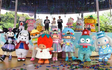 〔写真説明〕特別セレモニーに集まったサンリオキャラクターら=26日、大分県日出町